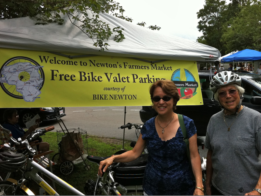 Momentum really started to gather: In February 2010, Bike Newton was awarded 501(c)3 nonprofit status. Helen Rittenberg became Bike Newton’s first president. She and Lois Levin were well-known for advocating to elected officials about the need to make Newton more bike friendly and for operating the Bike Newton bike valet service at the Newton Farmer’s Market (see image below). Bike Newton began offering Helen initiated and led weekly “family-friendly, no rider left behind” rides from the library to destinations across the city, which demonstrated how bikeable Newton is and taught hundreds of Newton cyclists how to be safer on the roads.